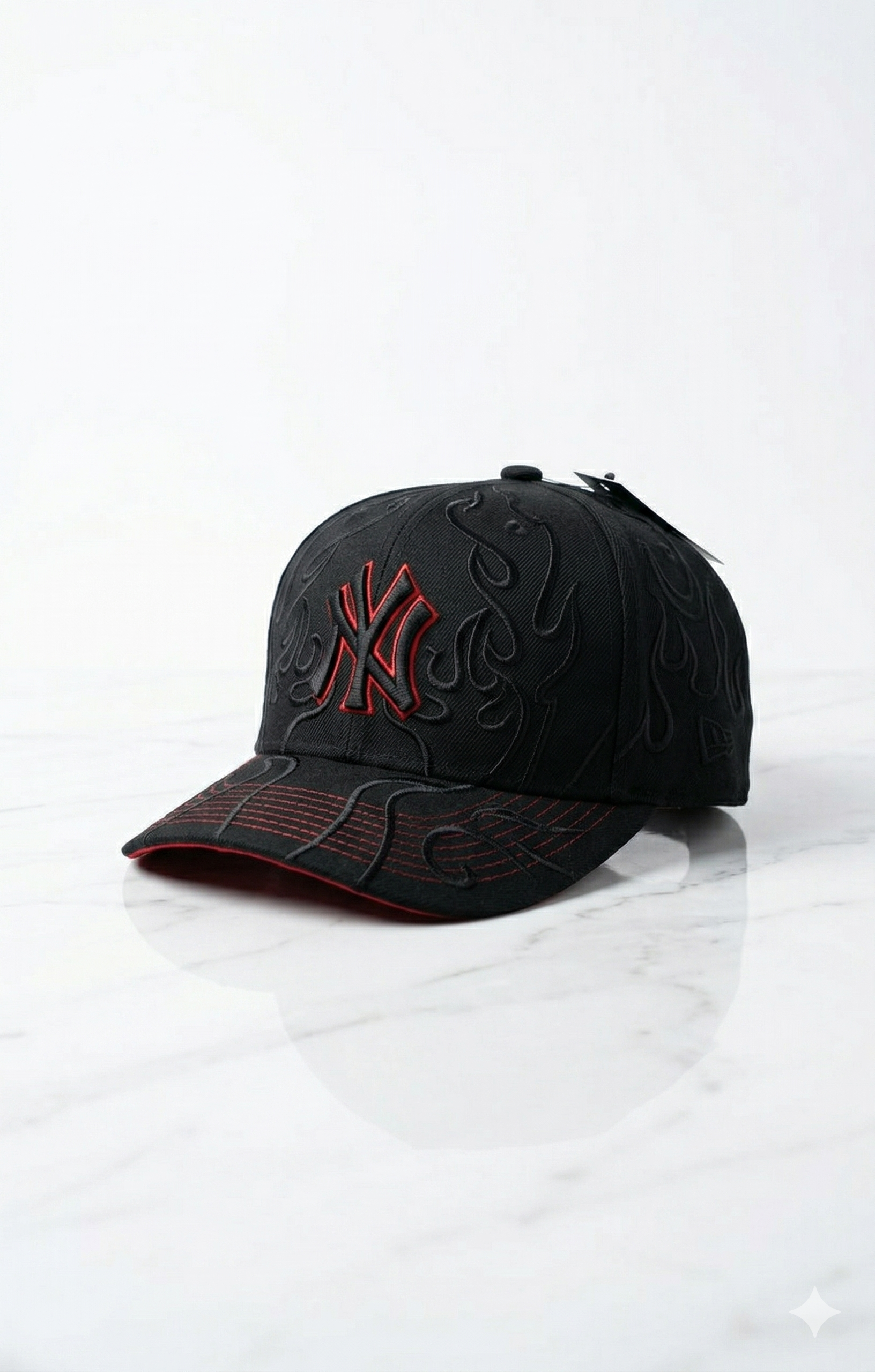 Atrevida, urbana y llena de actitud. Esta gorra NY negra con detalles rojos y diseño de fuego en la parte frontal es perfecta para quienes buscan un estilo llamativo y diferente.
