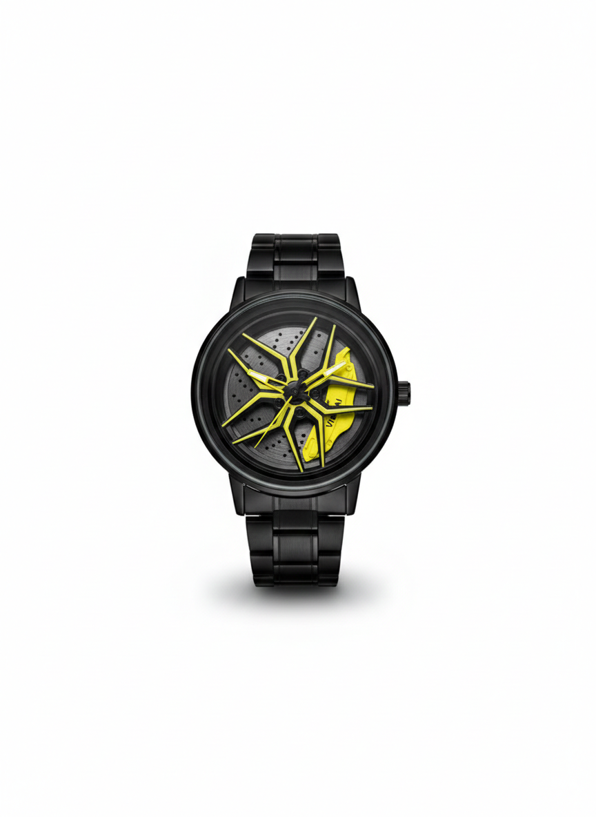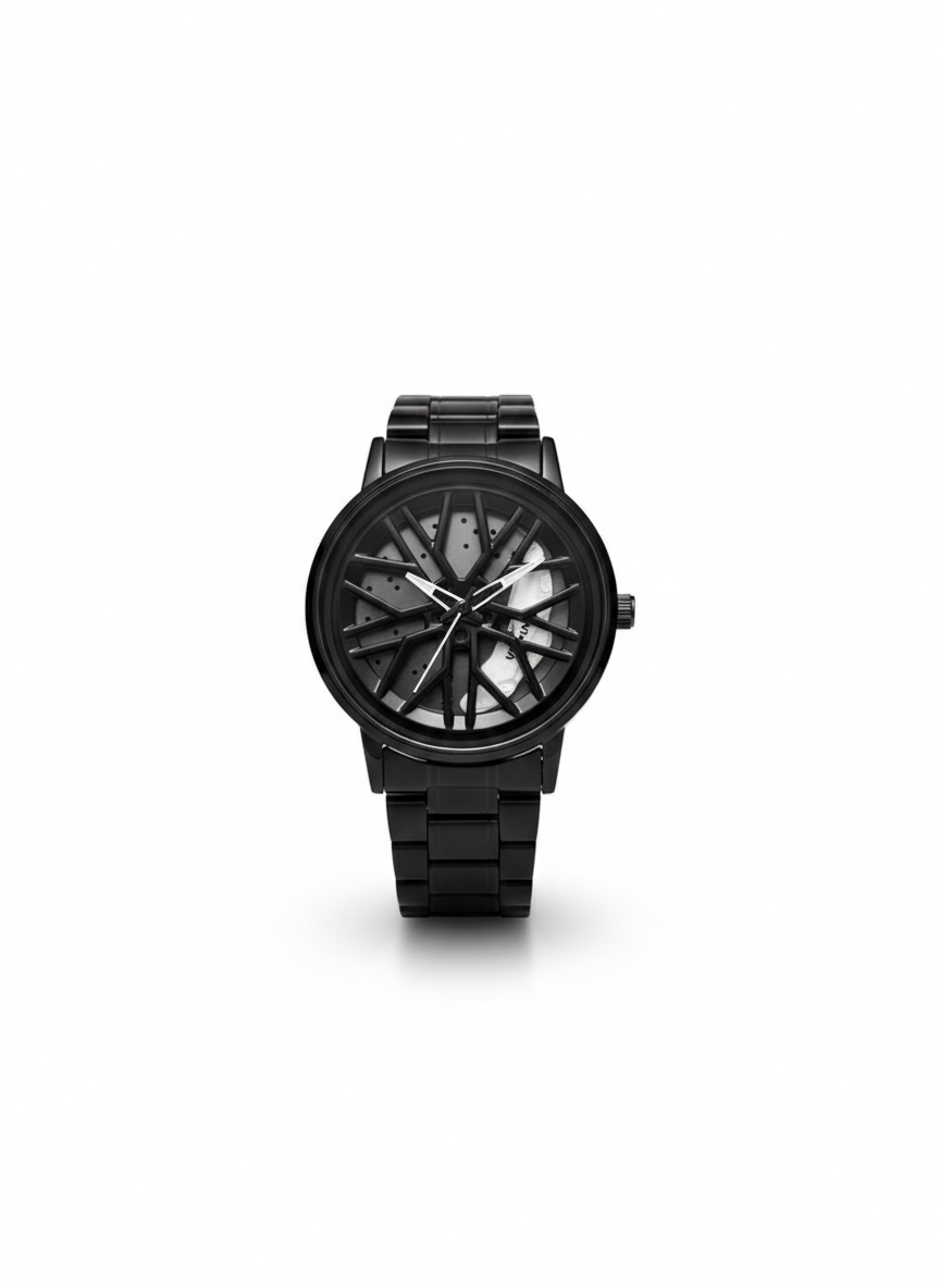 Moderno, deportivo y con diseño impactante. Este reloj de rin giratorio en color negro es perfecto para los amantes de los autos y la velocidad que buscan un accesorio diferente y llamativo.