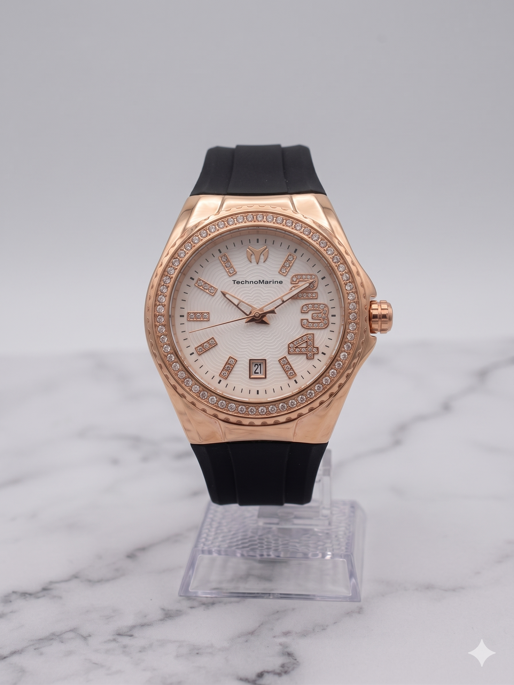 Elegante, exclusivo y con detalles únicos. Este Technomarine combina una esfera con perlas, manilla negra y perilla en oro rosa, creando un diseño sofisticado y llamativo.
